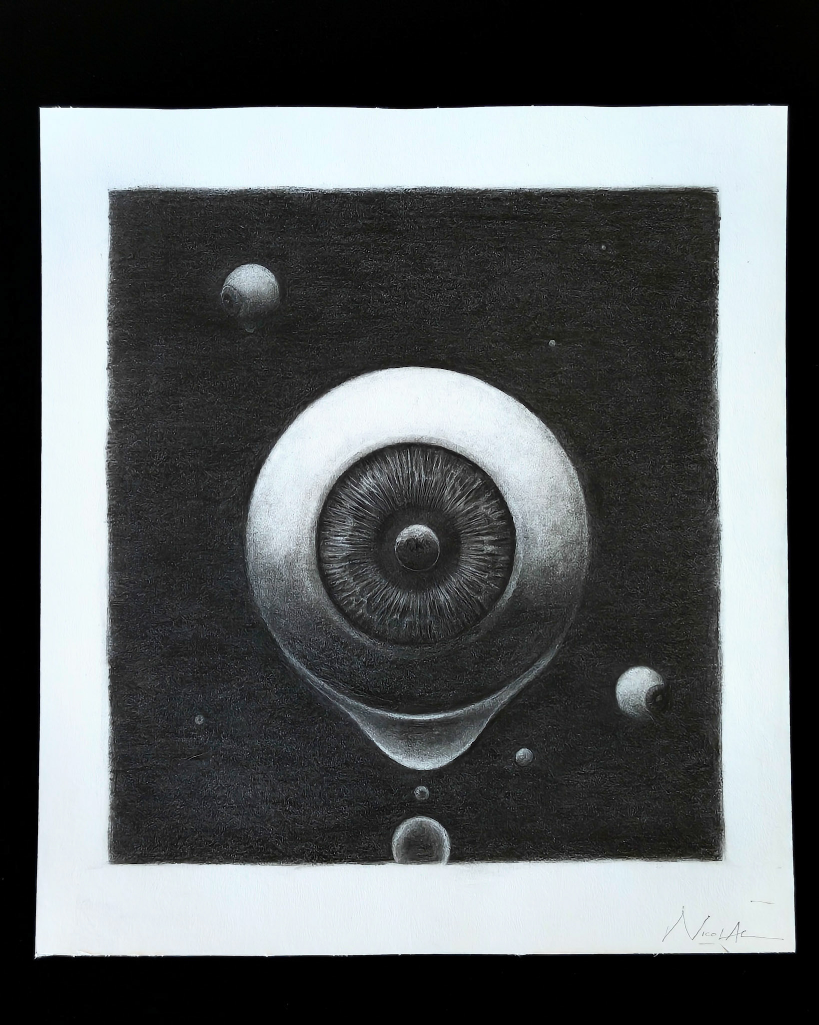 Idiopsis I represents the coexistence of multiple inner worlds. The floating eyes do not observe the same reality; each contains a world unto itself. They hover in proximity yet remain sealed, autonomous. At the base of every internal world rests a tear—an essential, irreducible core of pain. This pain is not dramatic or externalized; it is structural. It sustains the world above it, suggesting that suffering is not an exception to subjectivity but one of its founding elements. The image holds these worlds together without merging them, affirming simultaneity without communion.