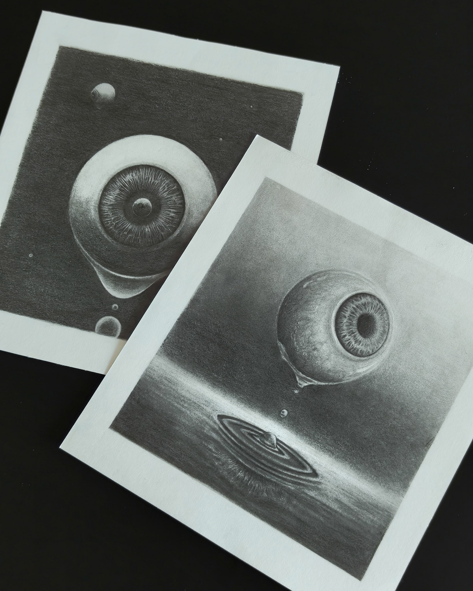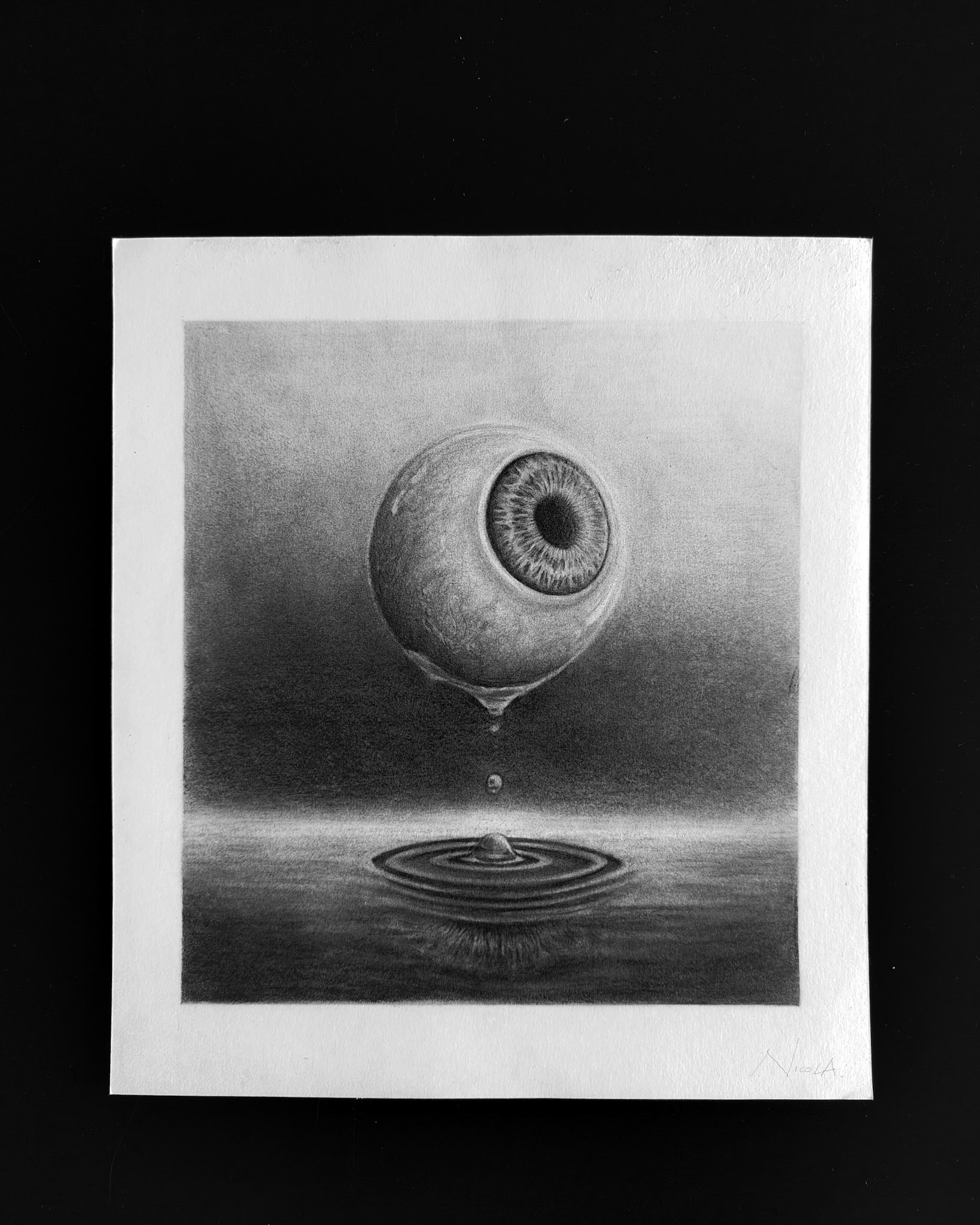 Idiopsis II introduces a shift in depth. Here, a single eye emerges from a stagnant body of water, as if surfacing from within its own interior landscape. The eye appears to be lacrimating, but the tear is no longer contained—it threatens to dissolve into the surrounding medium. Beneath the surface, a second eye is faintly visible, submerged, watching from below. This duplication suggests layers of perception: the eye that sees, the eye that is seen, and the eye that remains trapped beneath consciousness. Pain, in this image, is no longer foundational but cyclical—rising, sinking, re-emerging.