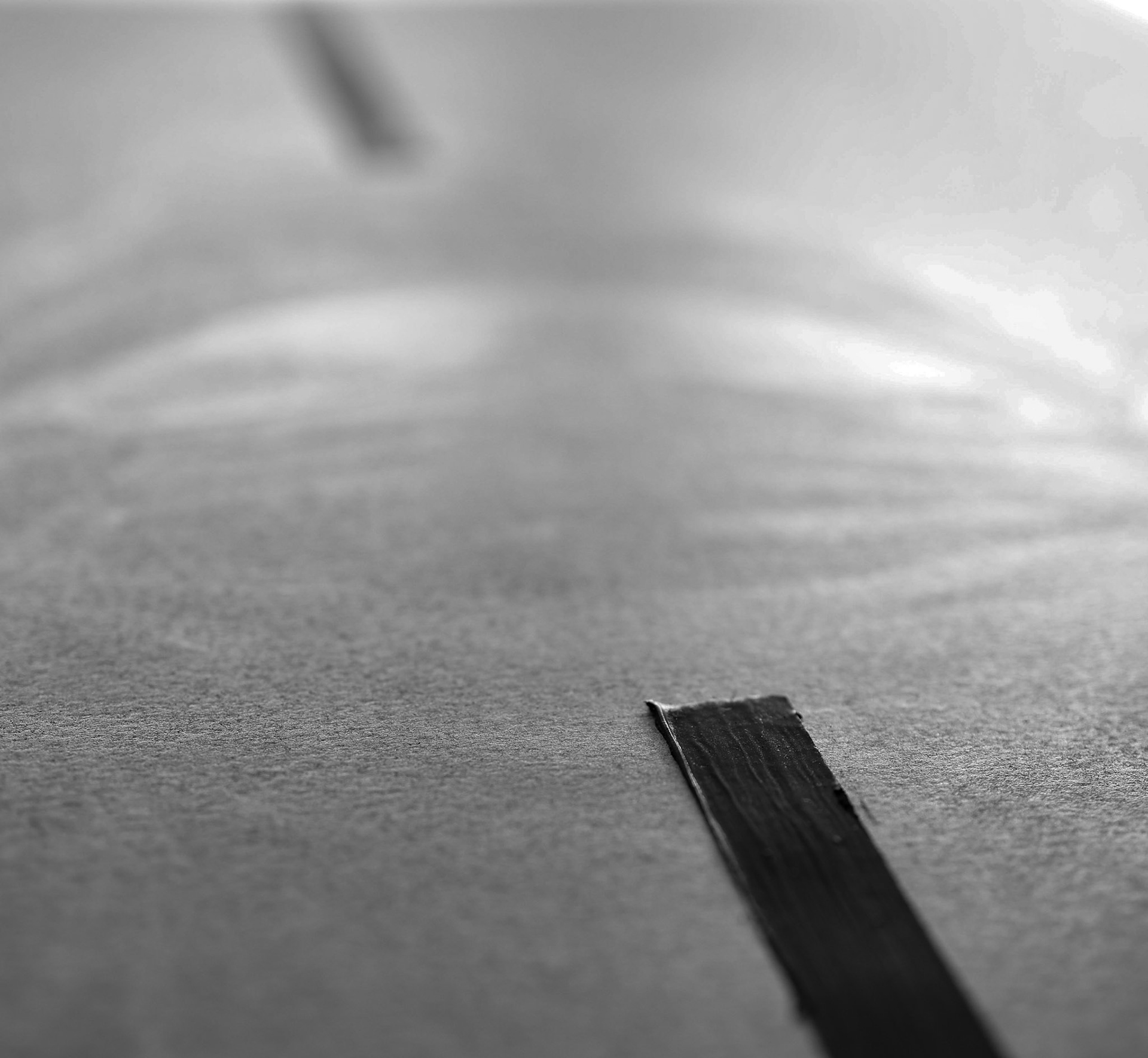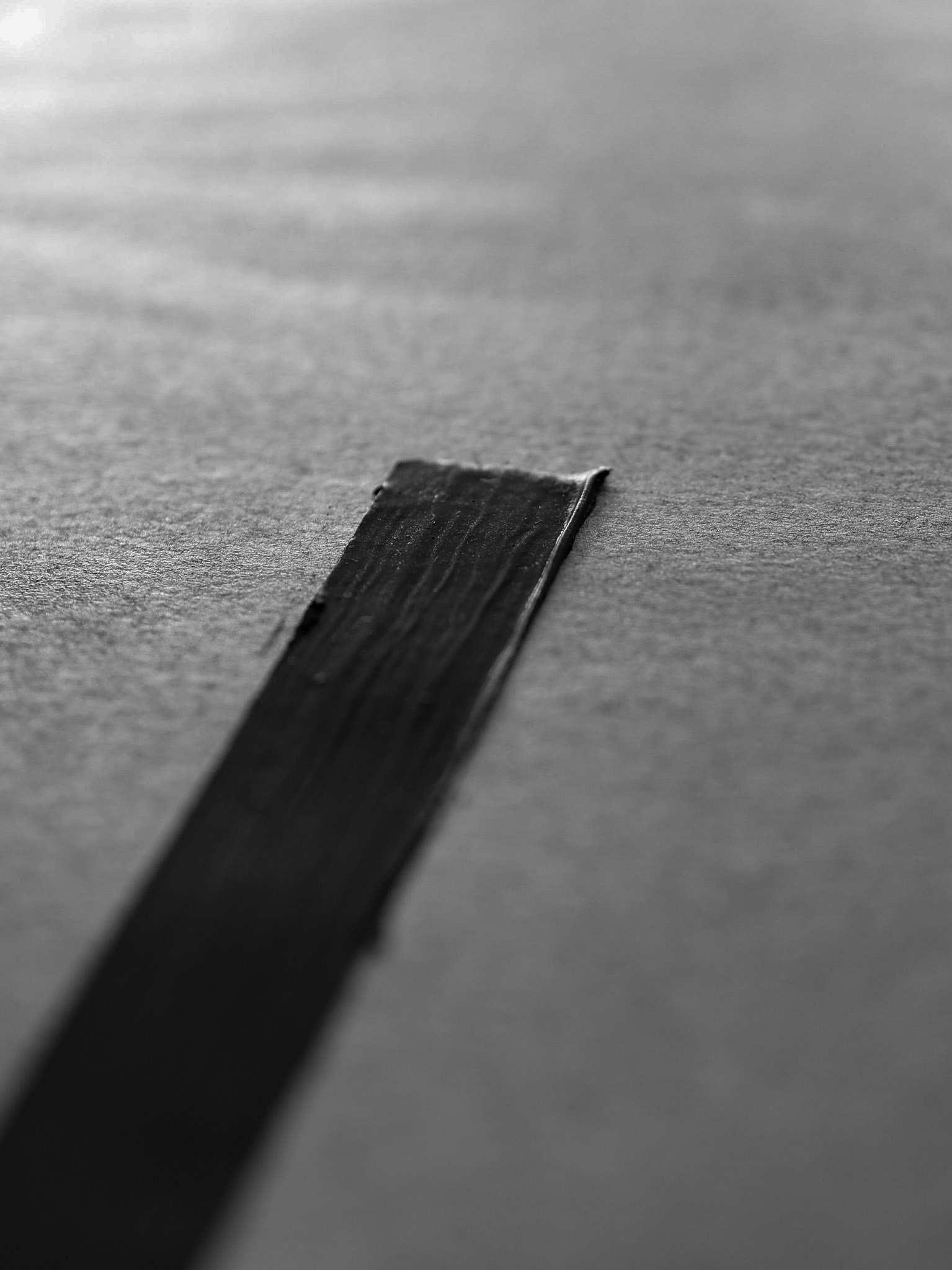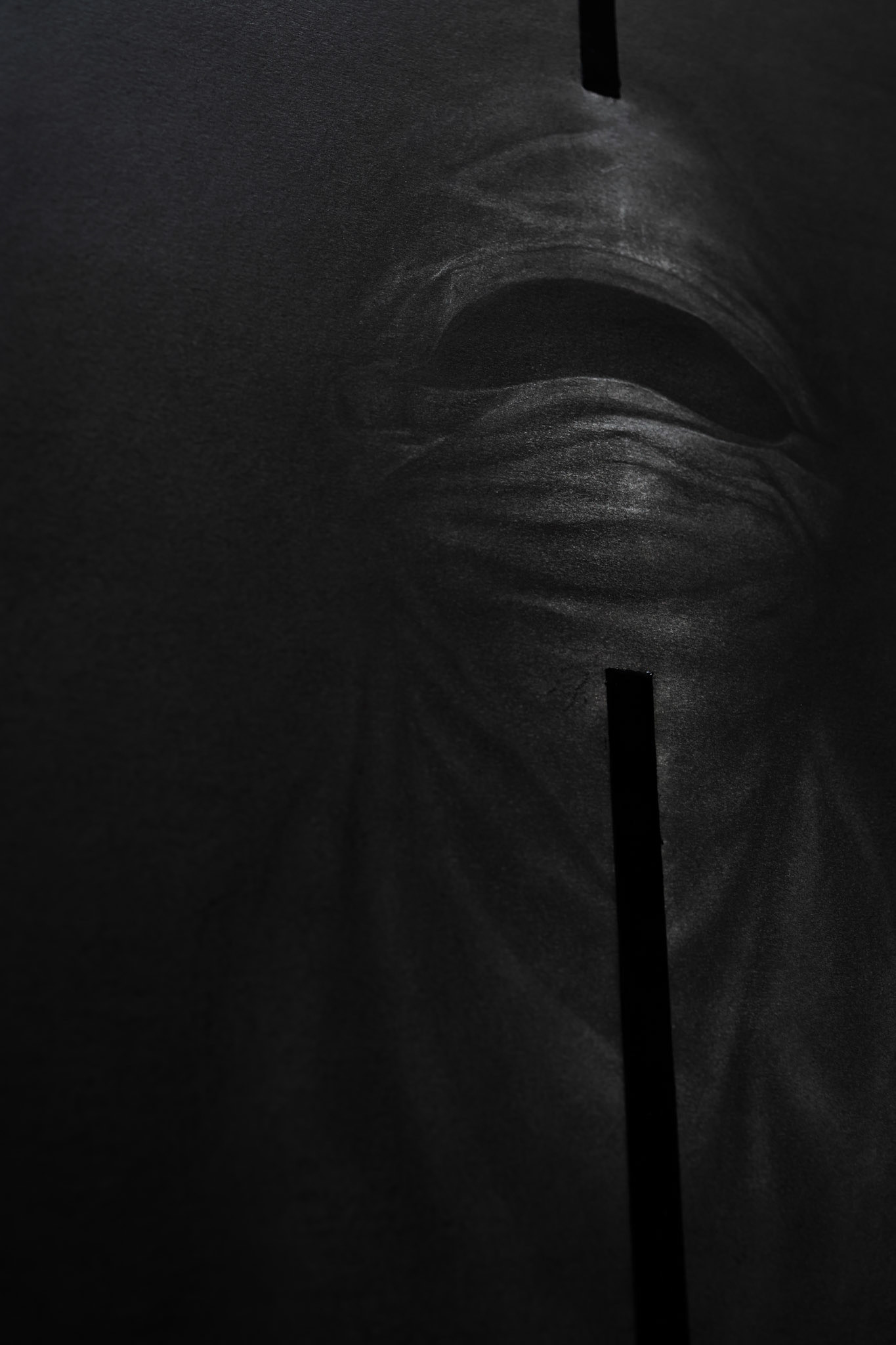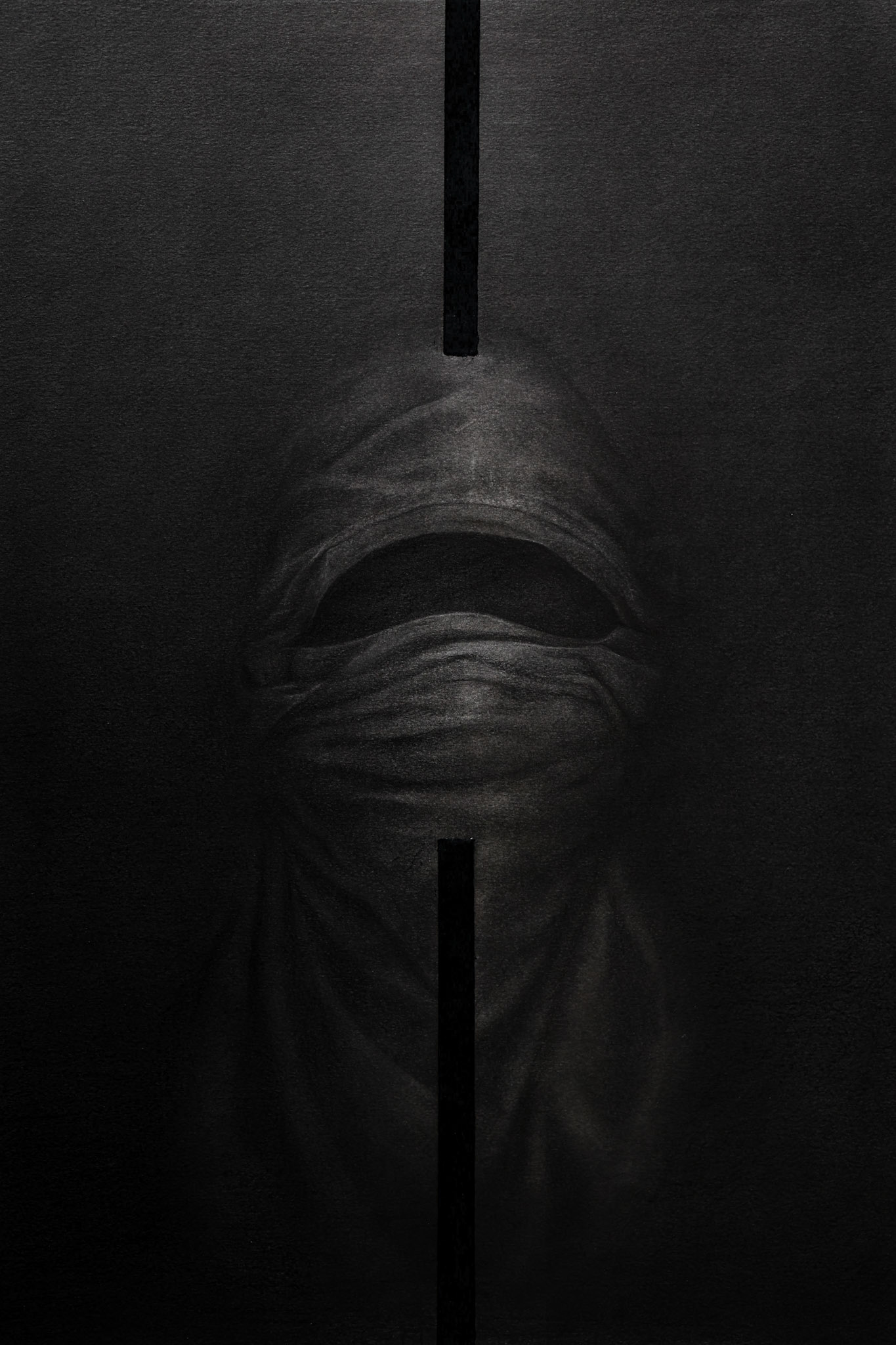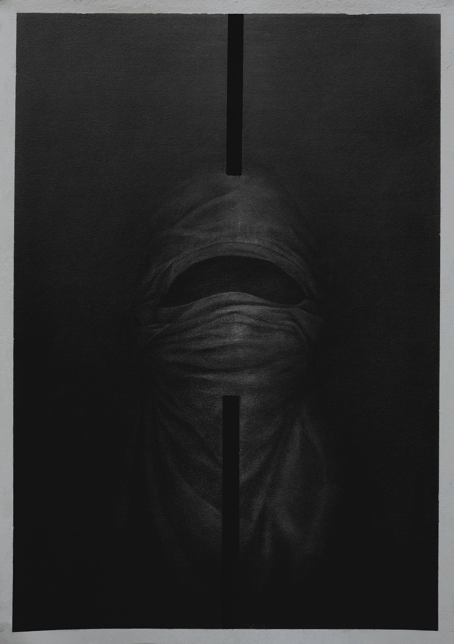 An anonymous face, concealed by a balaclava, appears as a neutral surface — an identity suspended, ready to be inhabited. The central stroke of black gouache does not describe, but interrupts. It functions as a wound, a censor, an act of negation that is also protective.