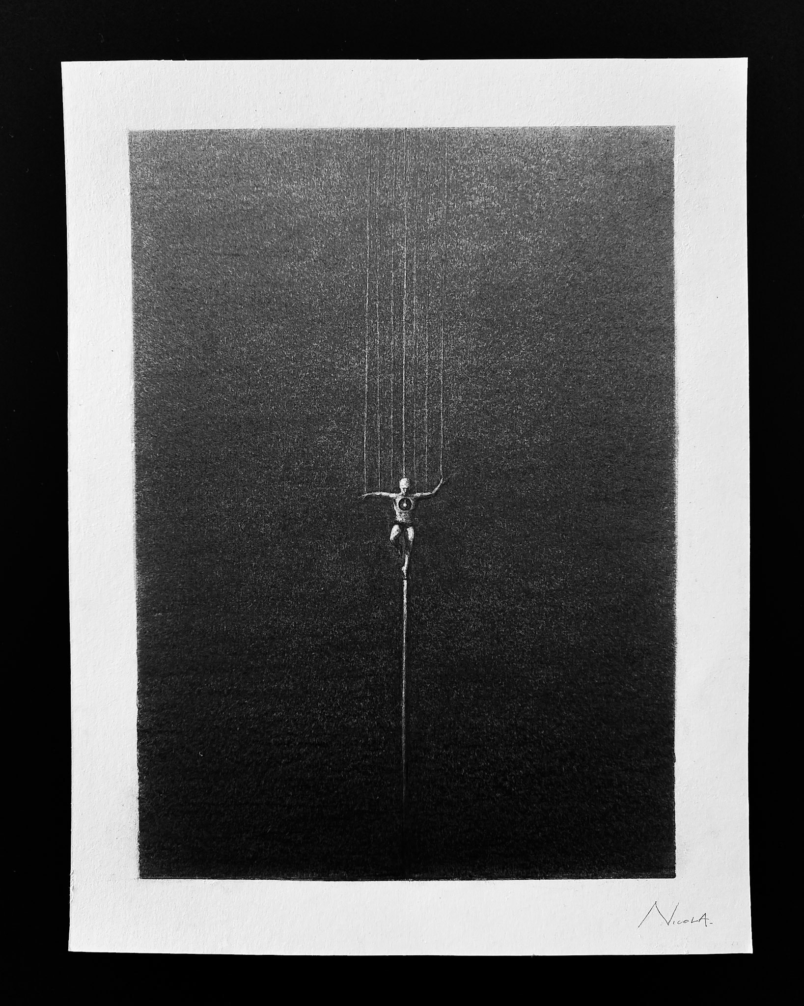 Tethered by cables and guided by the pendulum in his chest, every movement teeters on the edge of instability.