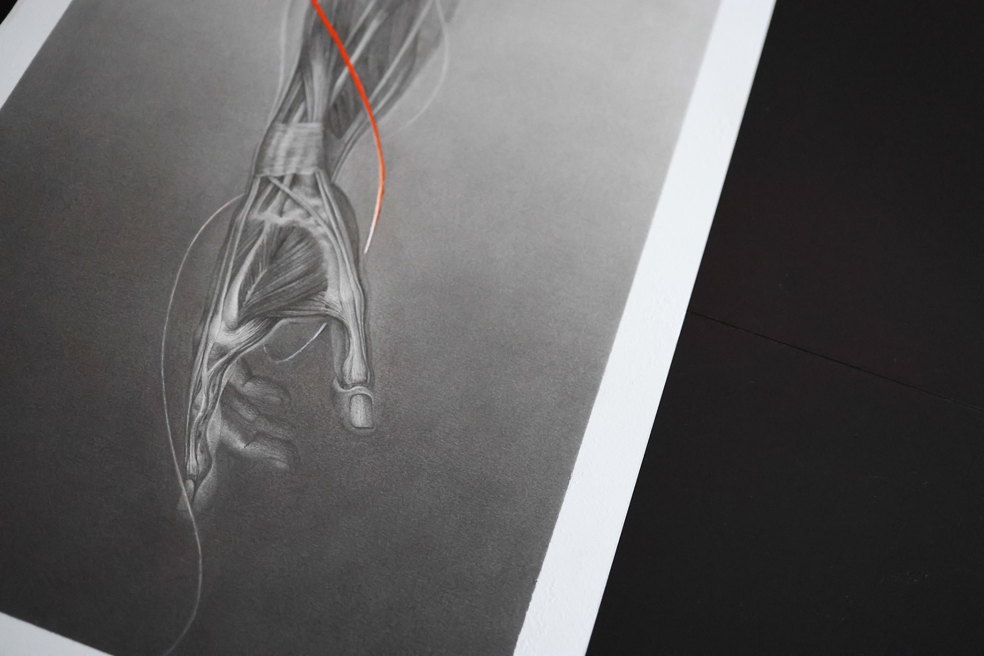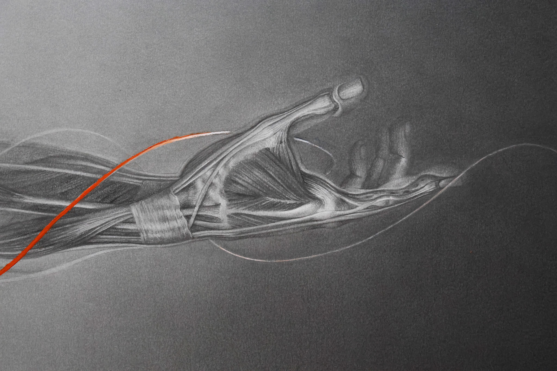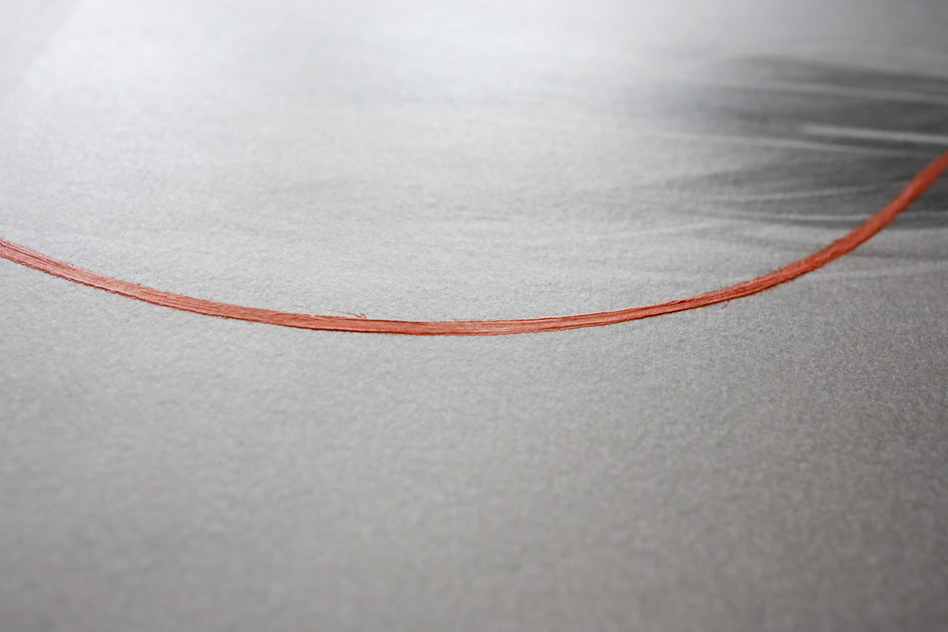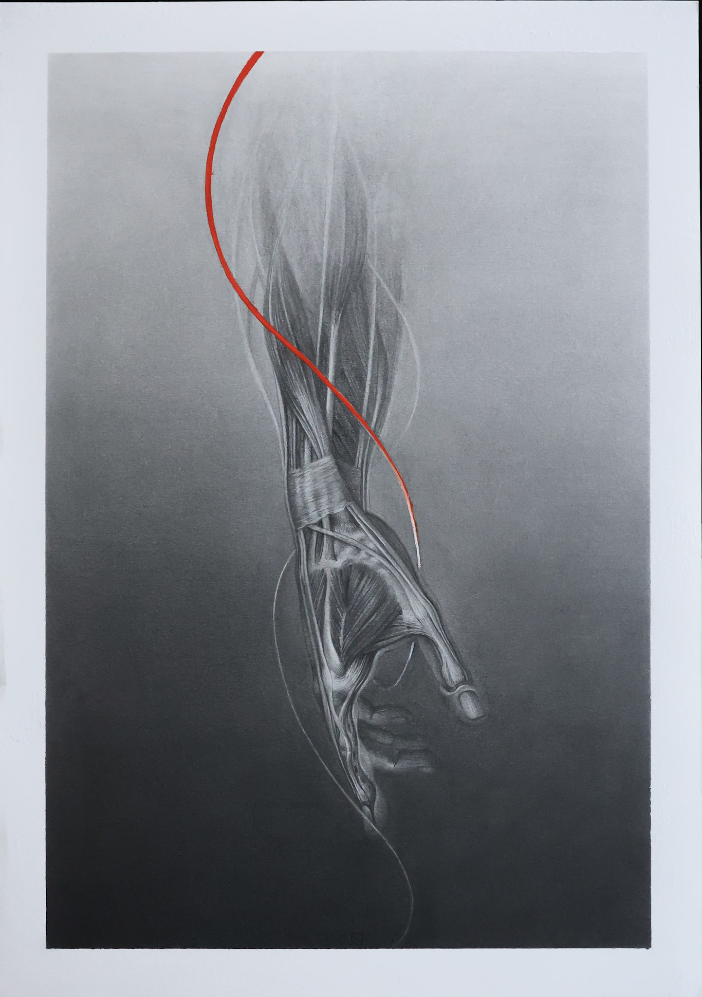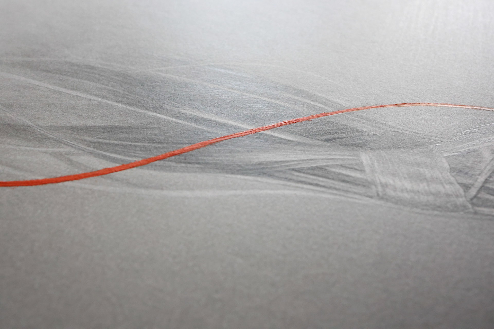 A moment of suspension in which the being dons its earthly skin to encounter the contingency of reality. Life unfolds precisely within this act of inhabiting matter. Threshold traces the delicate boundary between inner and outer states, presence and dissolution, where existence is possible only through embodiment. The orange gouache brushstroke, dissolving into white, signals this living threshold: a subtle pulse where form briefly comes into being before fading again.